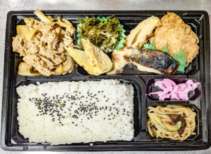 ・ヒレカツ ・サバのみそ焼き ・竹輪煮 ・厚焼き玉子 ・牛焼肉